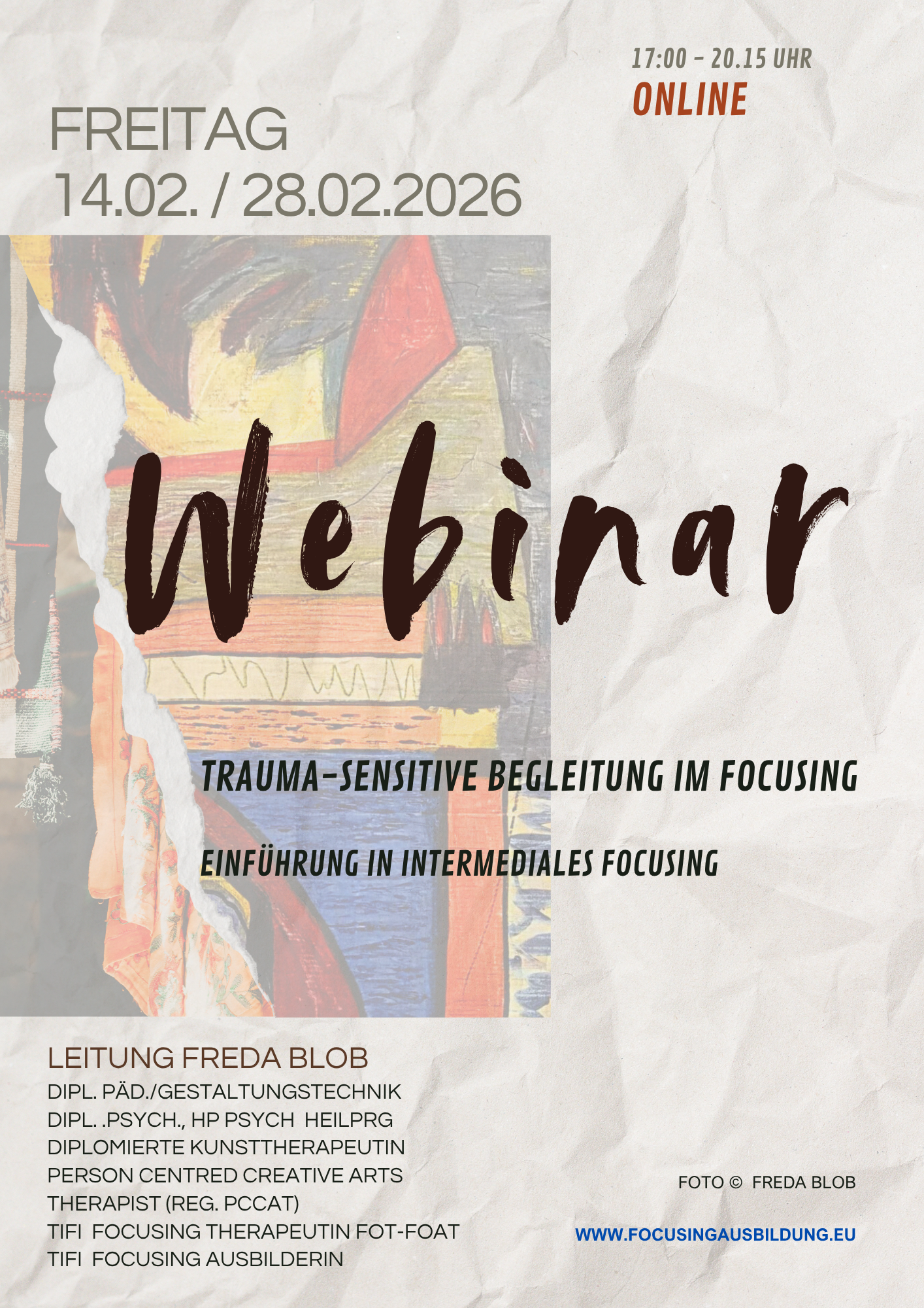 Leitung: Freda Blob, TIFI Focusing Ausbilderin, FOAT-TIFI Therapeutin, Reg. Person Centred Creative Arts Therapist, PCE Psychotherapist/Counselor, Gesprächstherapeutin und Lehrberaterin GWG, Diplomierte Kunsttherapeutin, Diplom Pädagogin, Diplom Psychologin